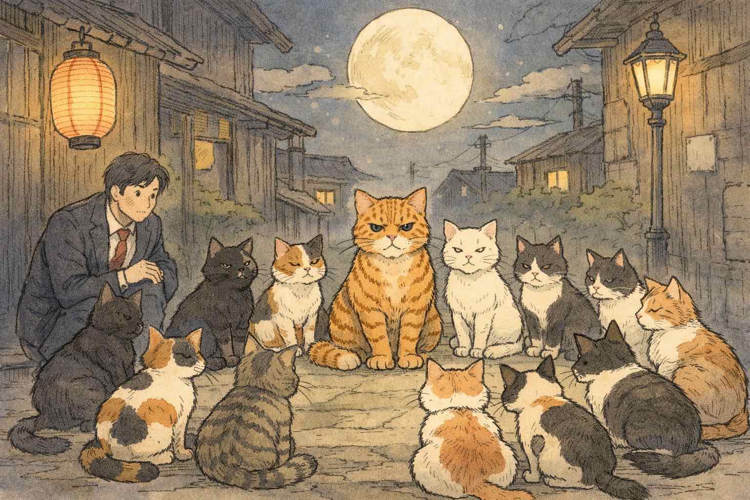 急に振られ、俺は新人のように右往左往した。猫たちの目が一斉に俺を射抜く。揺れる影、冷え切った夜風。俺は絞り出すように、胸の奥に溜まった澱(おり)を打ち明けた。